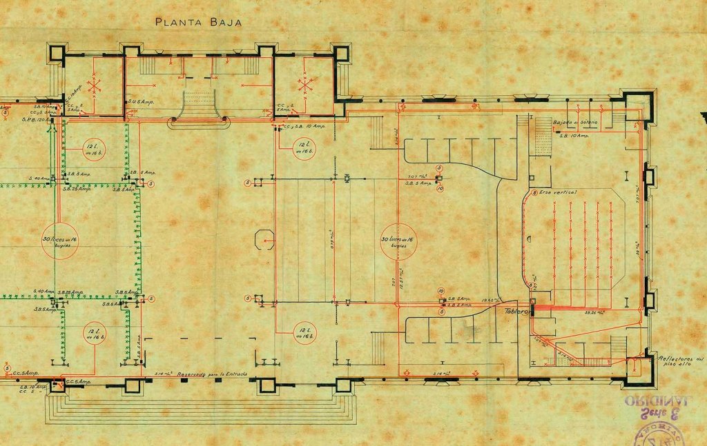 Un plano de la instalación del alumbrado eléctrico del pabellón de la empresa Juan Waldorp y Cía. muestra la ubicación del teatrito ocupando el ala derecha de la planta baja.