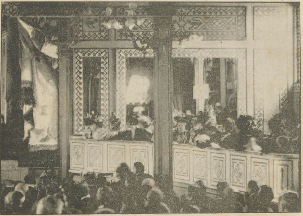 El pequeño teatro, una joya de buen gusto, todo blanco y oro con adornos de terciopelo celeste, obra del arquitecto Sr. Morra, fué muy ponderado, así como el restaurant, cuyos planos y decorado pertenecen al mismo caballero.