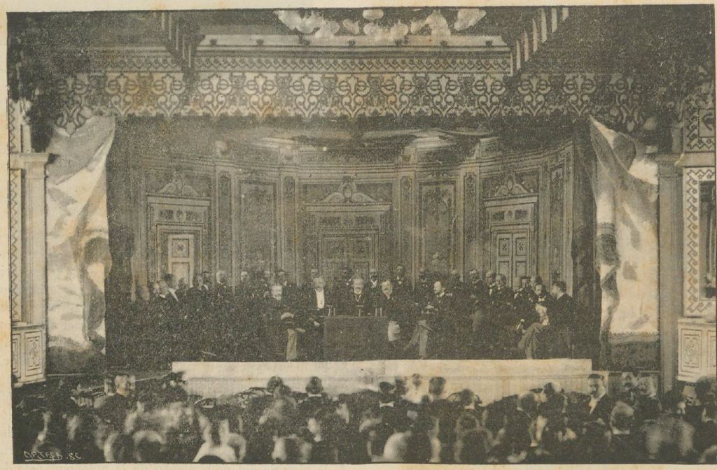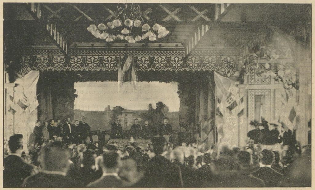 Concurrido por numerosas familias estuvo ayer durante el dia el Pabellón Argentino, siendo lástima no lo estuviese tanto por la noche, á pesar de que estaba anunciada la inauguracion del precioso teatrito. Este es una verdadera joya, construido á todo costo y con el más exquisito gusto en el decorado. Es una pequeña salita pintada de blanco y oro, siendo las cortinas y demás colgaduras de pelouche celeste. Tiene capacidad como para 250 personas, entre sus 8 (sic) palquitos y la platea. El programa fué totalmente cumplido, excepcion hecha del monólogo anunciado por el señor Julián Romea, que no pudo decirlo por tener que trabajar en la Zarzuela á la misma hora que debia hacerlo en el Pabellón.