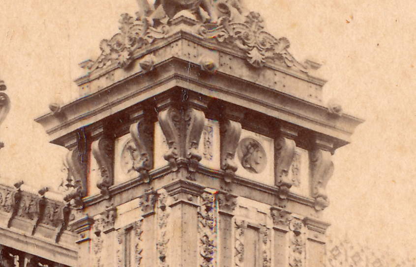 Estos medallones decoraban el centro del friso de los pilones esquineros del pabellón en tres de sus caras; la cuarta (fachada lateral, interna) quedaba parcialmente oculta desde el suelo por la pendiente del techo.