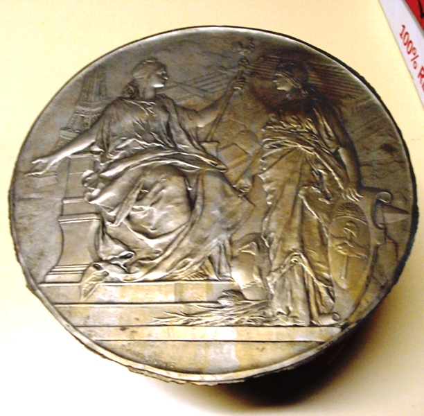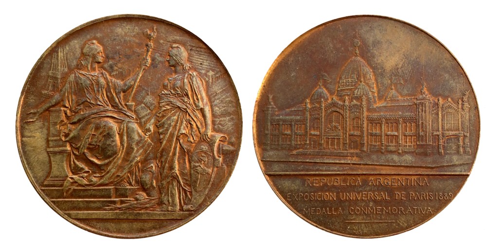 La República Francesa recibe a la República Argentina en la Exposición Universal de 1889. – La República Francesa sentada a la derecha (sic), sosteniendo en su mano izquierda un cetro rematado en un gallo, recibe a la República Argentina de pie frente a ella, apoyándose en el escudo nacional; a sus pies, un bulto y plantas; al fondo del campo, vista de la Exposición con la Torre Eiffel. Inscripción: DANIEL • DUPUIS. – Reverso. Vista de pabellón de la República Argentina. Inscripción: REPUBLICA • ARGENTINA | EXPOSICION UNIVERSAL • DE • PARIS • 1889 | MEDALLA • COMMEMORATIVA; abajo, a la derecha: DANIEL • DUPUIS. – Diámetro, 50 mm.