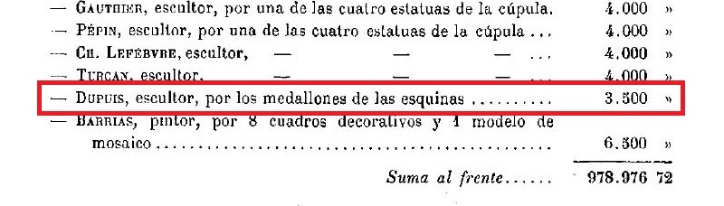 En las dos últimas líneas del cuadro aparece el artista Daniel Dupuis. Había cobrado entonces 3.500 francos por “medallones exteriores representando a las provincias”, y otros 3.000 por un anticipo para el grabado de la medalla conmemorativa, del que se le adeudaba un saldo de 1.500 francos.