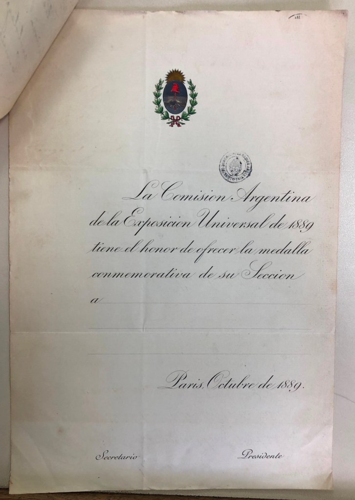 Una parte de las naciones que concurren a la Exposición ha resuelto mandar grabar respectivamente medallas conmemorativas de dicha solemnidad. Convendría acaso que la República Argentina siguiese este ejemplo, teniendo así ocasión de ofrecer un recuerdo a las autoridades francesas, las que siempre nos han prestado una ayuda eficaz y decidida. El costo del grabado de la medalla de la matriz etc. etc. sería de 4000 francos, más o menos y ruego a Vd se sirva transmitirme al respecto la resolución de esa Comisión a fin de proceder en el sentido indicado si fuese aquella favorable.