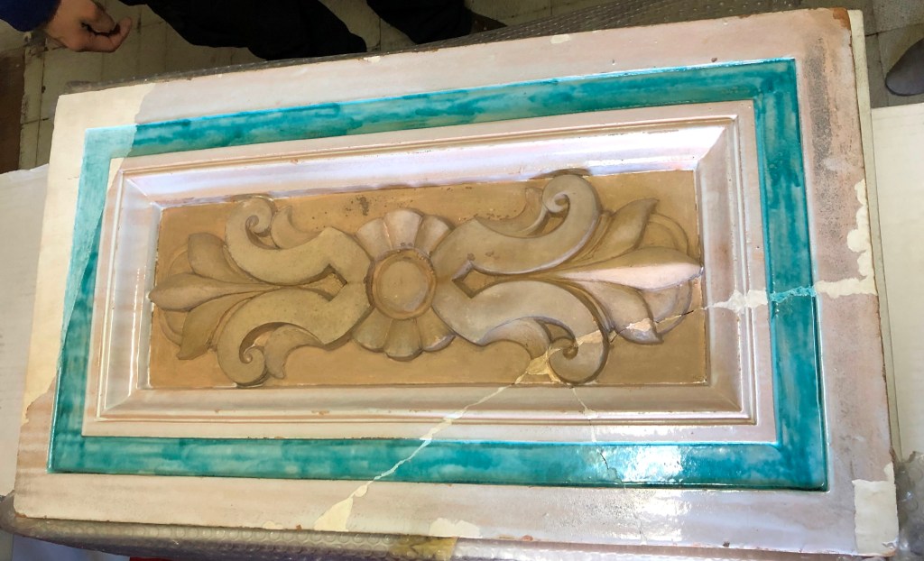 Se conoce su tamaño, porque el Museo Histórico Cornelio de Saavedra conserva una de las placas cerámicas que los flanqueaban en el friso, y mide 71 cm de alto.