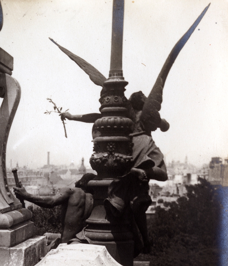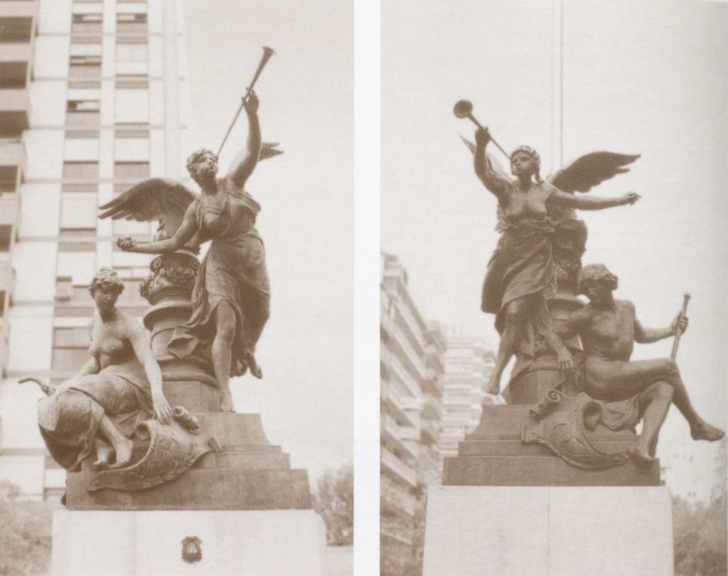 Las columnas esquineras del Pabellón Argentino estaban coronadas por mástiles con grupos alegóricos en sus bases. Eran dos motivos repetidos, ambos con una «Fama», figura femenina alada tocando una trompeta. Su autor, Ernest Barrias, era uno de los reconocidos artistas del momento convocados por Albert Ballu, el arquitecto y diseñador del edificio.