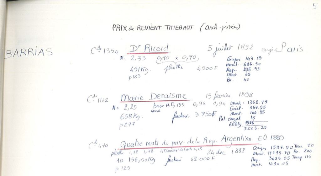 Aparecen en un listado de de precios de costo de bronces realizados por la fundición Thiébaut Frères de París, una de las de mayor renombre en Francia. Costaron 42.000 francos, y la empresa los describe como «Cuatro mástiles del pabellón de la Rep. Argentina, EU 1889.» Barrias había percibido 20.000 francos por el par.