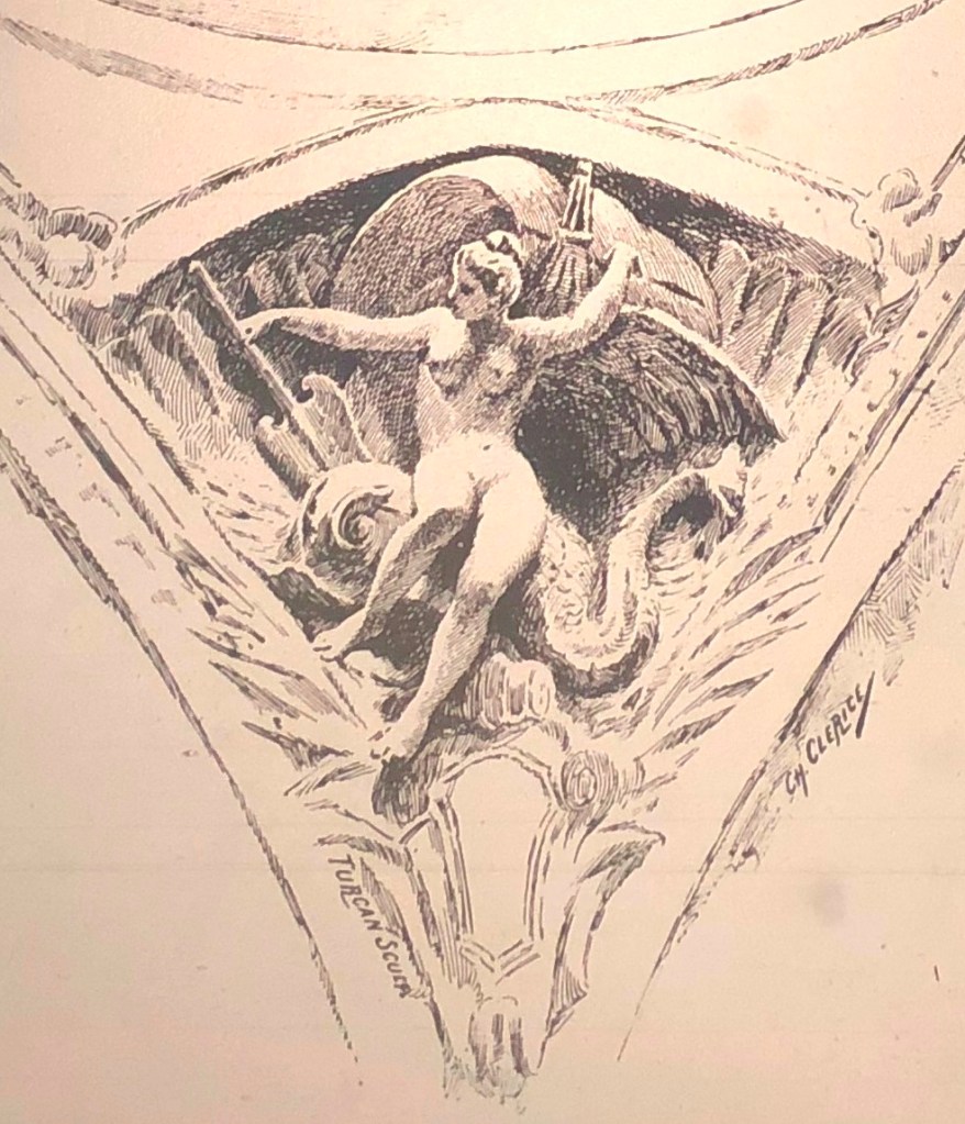 Este mismo tema, denominado como Comercio Marítimo e incluyendo el timón y un monstruo marino, obra de Jean Turcan, aparece en la decoración interior en una de las cuatro pechinas de la cúpula principal pero la figura es femenina, tal vez por homogeneidad con sus tres compañeras.