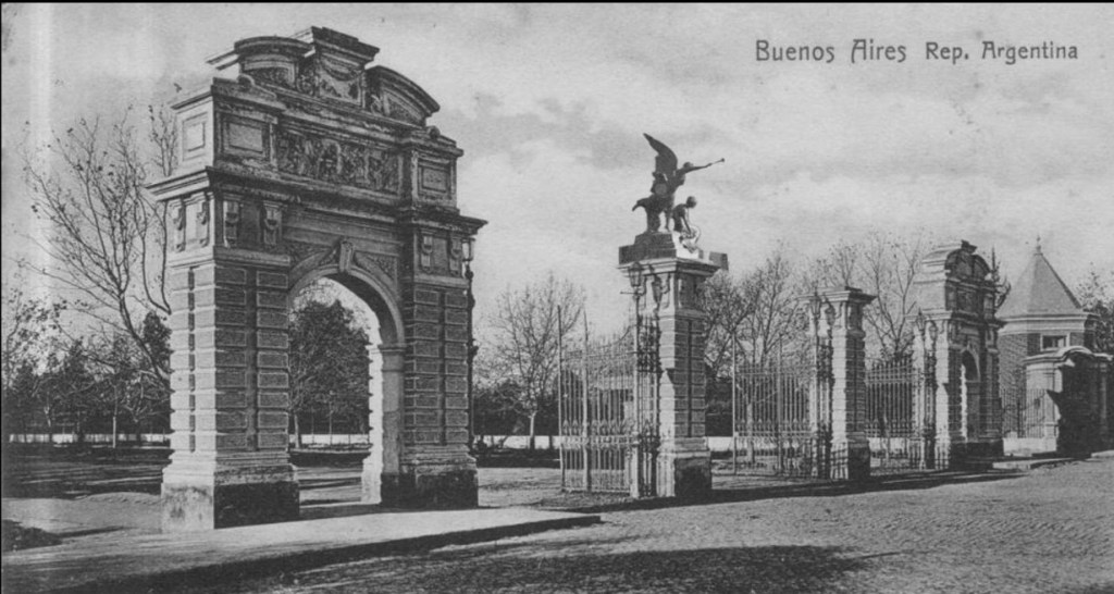 No se ha encontrado foto del par instalado en los portones del parque 3 de Febrero, pero esta recreación parcial debida a Gabriel de Meurville da una idea de lo que habría sido su aspecto.