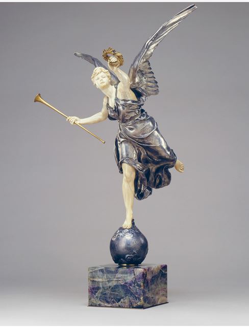 En un remate de Sotheby’s New York del 13 de septiembre de 1991, bajo el Nº 59 se vendió otra versión pero en bronce dorado, marfil, lapis lázuli y bronce plateado. El catálogo también menciona el vínculo con el monumento y agrega un dato interesante – el realizador del tallado en marfil era Émile-Philippe Scalliet (1846-1911), quien había estudiado con el escultor Paul Moreau-Vauthier. También menciona lo del Salon de 1902 y el número de catálogo.