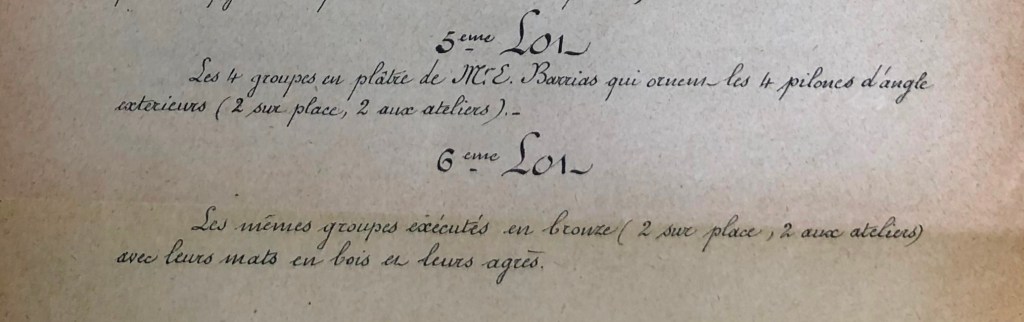 Como ya se comentó en Un bronce y su secreto, el pliego de condiciones (cahier des charges) de la venta del pabellón, de noviembre de 1889, demuestra que solamente dos de los grupos instalados en el edificio en París eran de bronce; los demás eran de yeso pintado de dorado, probablemente por no haberse recibido a tiempo los vaciados. Los otros dos bronces y yesos se encontraban en los ateliers.