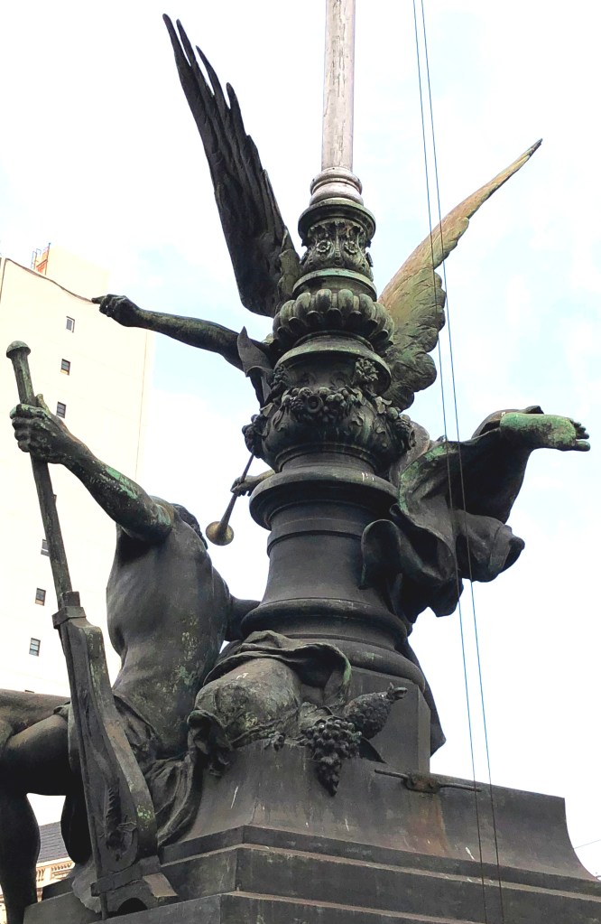 Ambos grupos muestran un gran equilibrio en la composición, combinando con elegancia el vuelo de las famas con el reposo de las figuras sentadas. La fama de La Agricultura toca la trompeta con la mano izquierda y originalmente llevaba otra en su mano derecha. Su pendant lo hace con la derecha, con una rama de laurel u olivo en la izquierda. Esta foto es del pabellón en Buenos Aires; no he encontrado una de París donde se vea claramente este detalle, pero allí sostenía la rama horizontalmente, desde su extremo.
