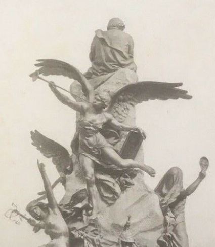 Cuando mencionan su origen, todas las fuentes dicen que la figura provenía de la que adornaba la parte posterior del monumento a Victor Hugo, también debido a Barrias y erigido en 1902 en la plaza homónima en París (XVI). Fue destruido en la segunda guerra mundial, fundido el bronce por el régimen de Vichy. Es similar en rasgos con la editada por Susse, pero la posición es completamente diferente y por la cronología, parecería ser lo opuesto: esta fama tuvo a La renommée como inspiración.