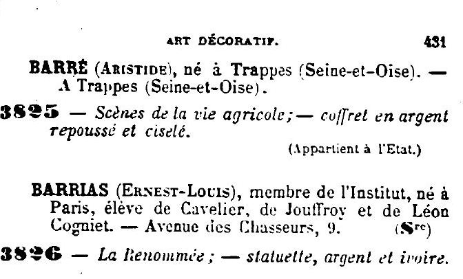 - [Catálogo] L’œuvre de Ernest Barrias. Exposition au salon des artistes français. Grand Palais des Champs Élysées. Du 15 Mai au 30 Juin 1908. Avec une notice de Georges Lafenestre (Membre de l’Institut). Paris, Typographie Philippe Renouard, 1908
