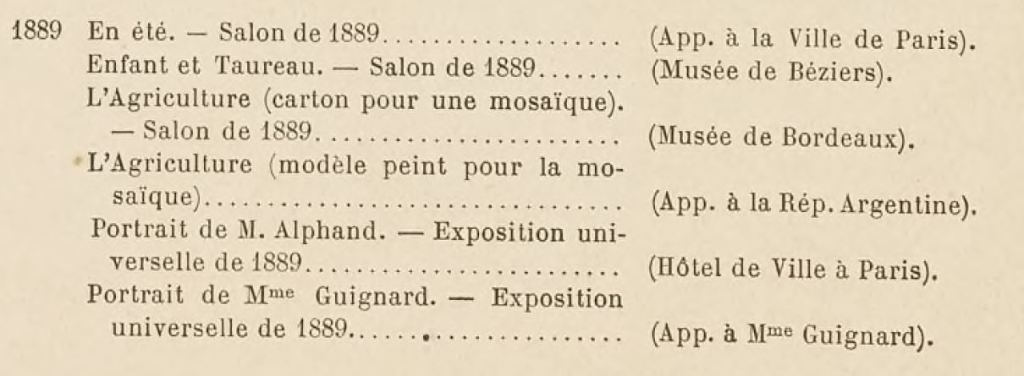 En el renglón anterior del listado de Guérinet aparece otra obra del mismo nombre, en la colección del museo de Burdeos. La referencia a que fue presentada en el Salon de 1889 es incorrecta porque no la muestra el catálogo de esa exposición, donde sí figuran las primeras dos: