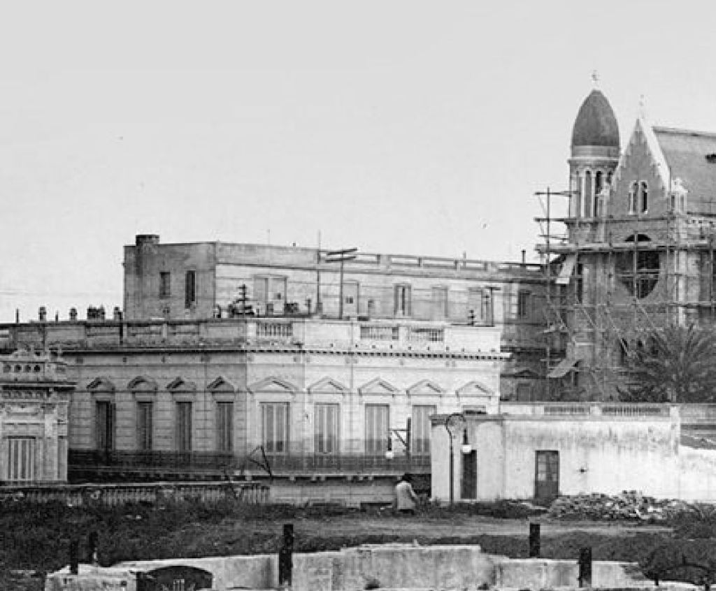 Ya avanzada la obra de la iglesia, una vista tomada desde la explanada del Pabellón Argentino; la casa de altos de la esquina de San Martín y la actual Ricardo Rojas la oculta parcialmente.