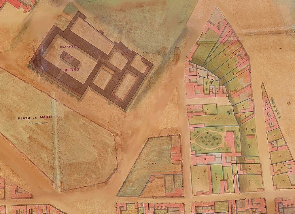 Se ve uno de los miradores de la casa al fondo, parcialmente oculta por el Cuartel del Retiro, en un detalle de una foto tomada desde la gruta de la plaza San Martín, de fines de la década de 1880.