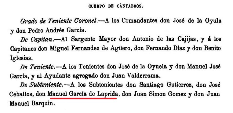 Manuel García Laprida había nacido en 1789 y se destacó en las invasiones inglesas, cuando formó parte como subteniente de la 4a Compañía del Tercio de Cántabros Montañeses, una de las milicias organizadas por Santiago de Liniers y reconocidas por Fernando VII. El comandante del cuerpo, don José de la Oyuela, estaba casado con María Francisca Negrón de la Torre, hija del primer matrimonio de su madre.