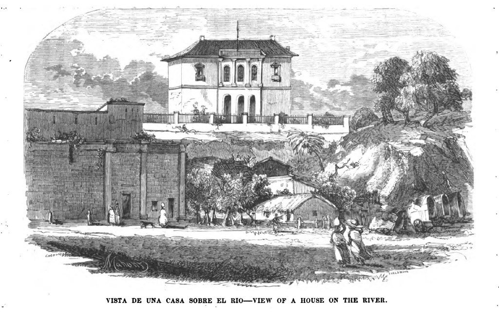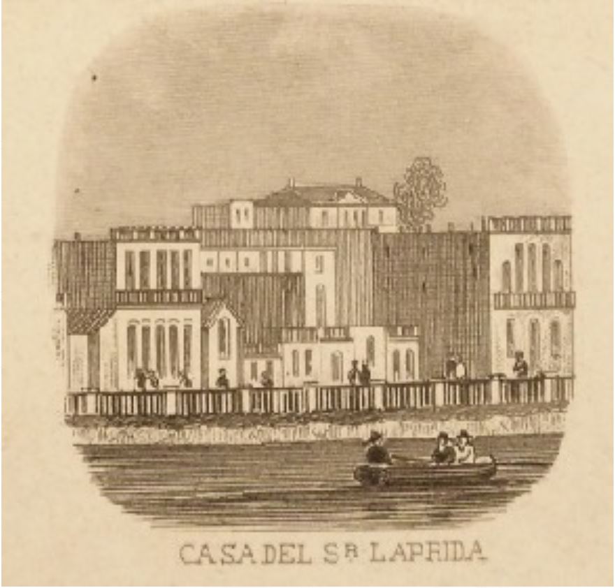 At the other end of the plaza is a fine house, built in English fashion, called Quinta de Laprida; it was for some years occupied by Dr. Scrivener, and is now an English school, under the direction of Dr. White. (En el otro extremo de la plaza hay una hermosa casa, construida al estilo inglés, llamada Quinta de Laprida; durante algunos años estuvo ocupada por el Dr. Scrivener, y ahora es una escuela inglesa, bajo la dirección del Dr. White.)
