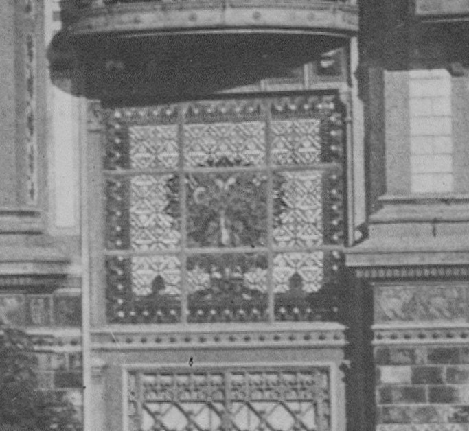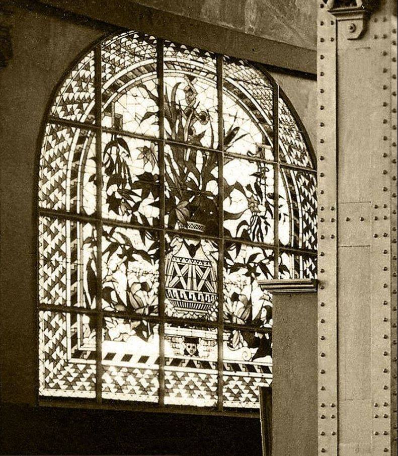 Sorprende que aparentemente exista una sola fotografía del vitral desde el interior del pabellón, tomada en Buenos Aires porque se nota un remiendo en la esquina inferior derecha. Es parcial; sólo se ve la parte central/inferior.
