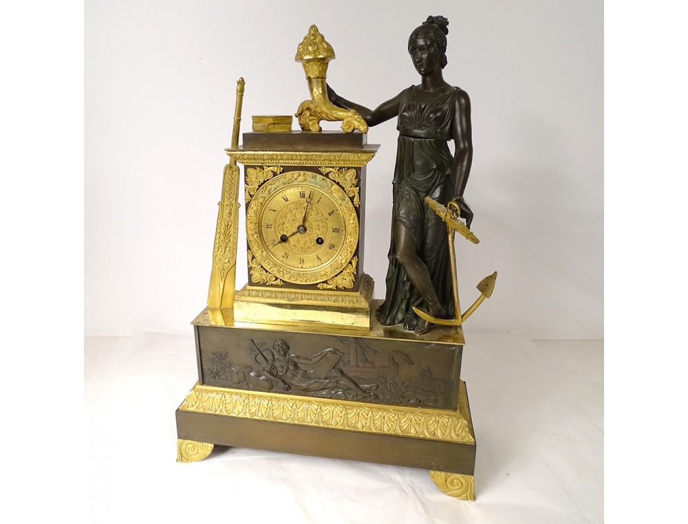 Los mismos elementos aparecen en elaborados relojes de mesa franceses cuyo tema es el comercio marítimo. En ambos de los mostrados debajo, la figura femenina se acompaña con un ancla y un timón; la base del primero presenta dos cornucopias, flanqueadas por una brújula y una rueda (¿de timón o de la fortuna?), mientras que en el segundo, la cornucopia está arriba del reloj.