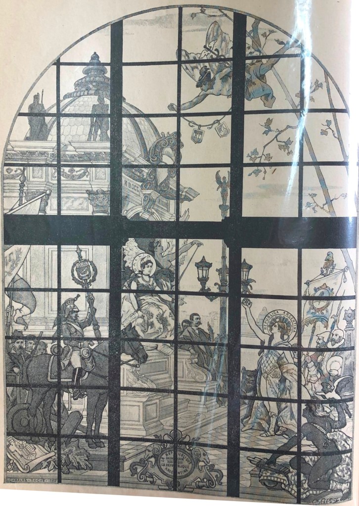 Al entrar el visitante al Pabellón en París, veía en el otro extremo, sobre la escalinata que llevaba a la planta alta, ese vitral realizado en base a un cartón de Charles Toché, La República Francesa y la Ciudad de París reciben a la República Argentina. Aparece en dos grabados publicados en la misma revista, el primero una vista del hall central desde la entrada en la planta baja. El dibujo adolece de un defecto en las proporciones del vitral, que era más alto de lo que aquí parece.