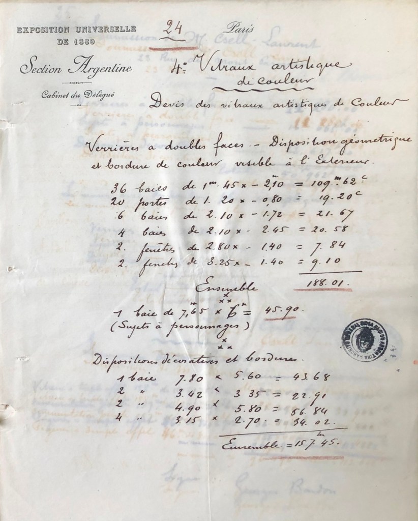 Henri Cabirau, secretario de la comisión de París, escribió el 4 de agosto de 1888 a Antonino Cambacérès, presidente de la de Buenos Aires, informando cuáles habían sido las empresas seleccionadas en los distintos rubros requeridos para la construcción del pabellón. El extenso documento, de más de 40 páginas, incluía para cada especialidad copias del pedido de presupuesto y las ofertas de las empresas convocadas a la licitación, las que según Cabirau eran solamente «casas de 1er orden.»