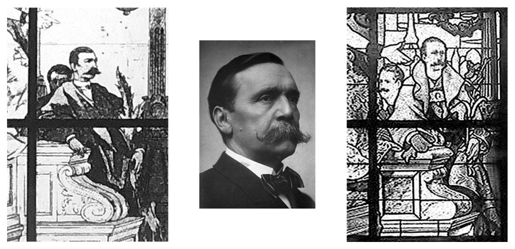 Algunas fuentes dicen que el del centro era el vicepresidente Carlos Pellegrini, quien asistiría a la inauguración de la exposición representando al gobierno argentino. En el dibujo de Clérice el parecido con su tradicional retrato fotográfico es innegable, pero no en el vitral terminado.