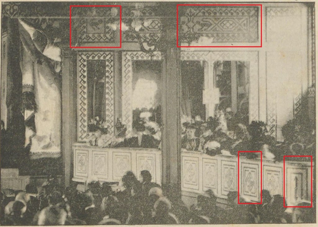 Carlo Morra, su creador, utilizó algunos de estos motivos en su decoración. En la foto siguiente se ve el felino y la serpiente, pero además de las guardas usó otro – un cuadrado de punta, con un dibujo geométrico en su interior, aplicado en el frente de los palcos.