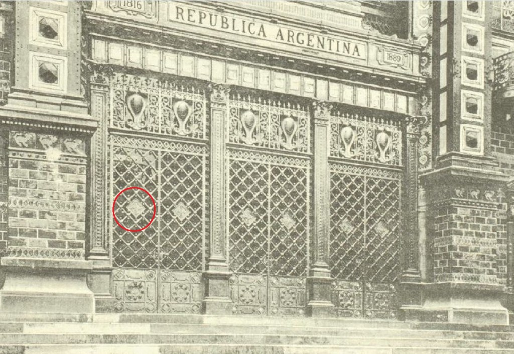 No he podido encontrar referencias a este motivo; la destacada ubicación que se le dió en las puertas y el hecho de que fuera usado nuevamente por Morra (si era el mismo) sugiere que se lo consideraba relevante. De ser un símbolo masónico, alguien ya habría puesto el grito en el cielo; tal vez era una «firma» esquemática de Ballu.