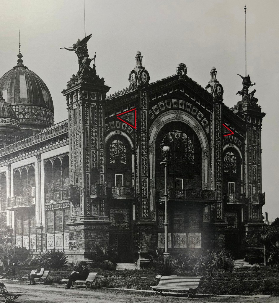 Aparece en el interior del pabellón, decorando las columnas que soportaban la cúpula principal. Se la ve en dibujos basados en fotos del edificio en París, y en Buenos Aires de 1895, pero no en imágenes de 1911 o posteriores, cuando ya se había instalado el MNBA. Una de ellas (arriba, a la derecha) muestra lo que parece ser un rastro borroso en un tramo de columna.