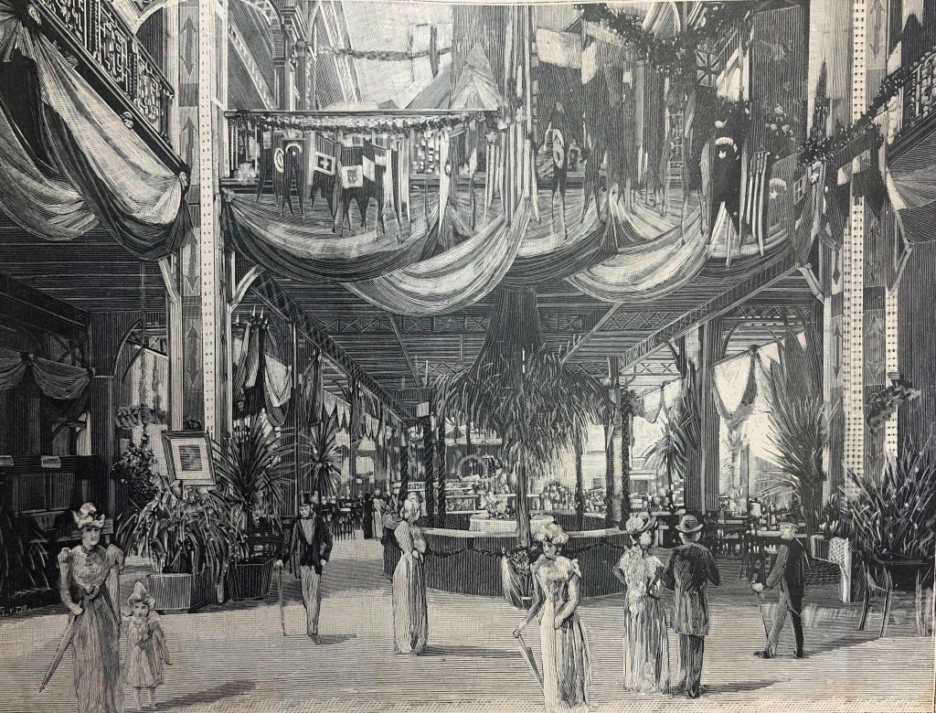 Cuando el Pabellón Argentino fue rearmado frente a la plaza San Martín en 1893, en el lado derecho de la nave de la planta baja se instaló una pequeña sala de espectáculos, que ya comentamos en la nota El teatrito celeste.