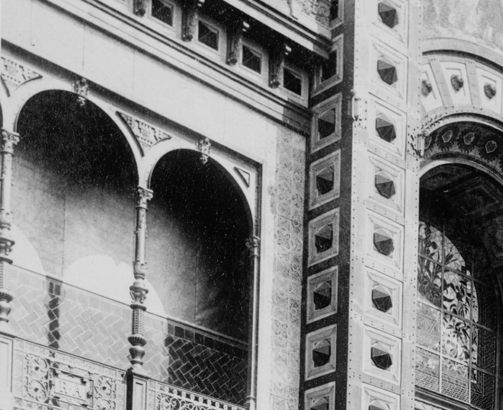 Todo el resto de la decoración – los cristales, las vitrinas, la cúspide, las puertas de hierro forjado, el pasamano de la escalera, etc., está ejecutado segun dibujos indios conservados en los museos argentinos.