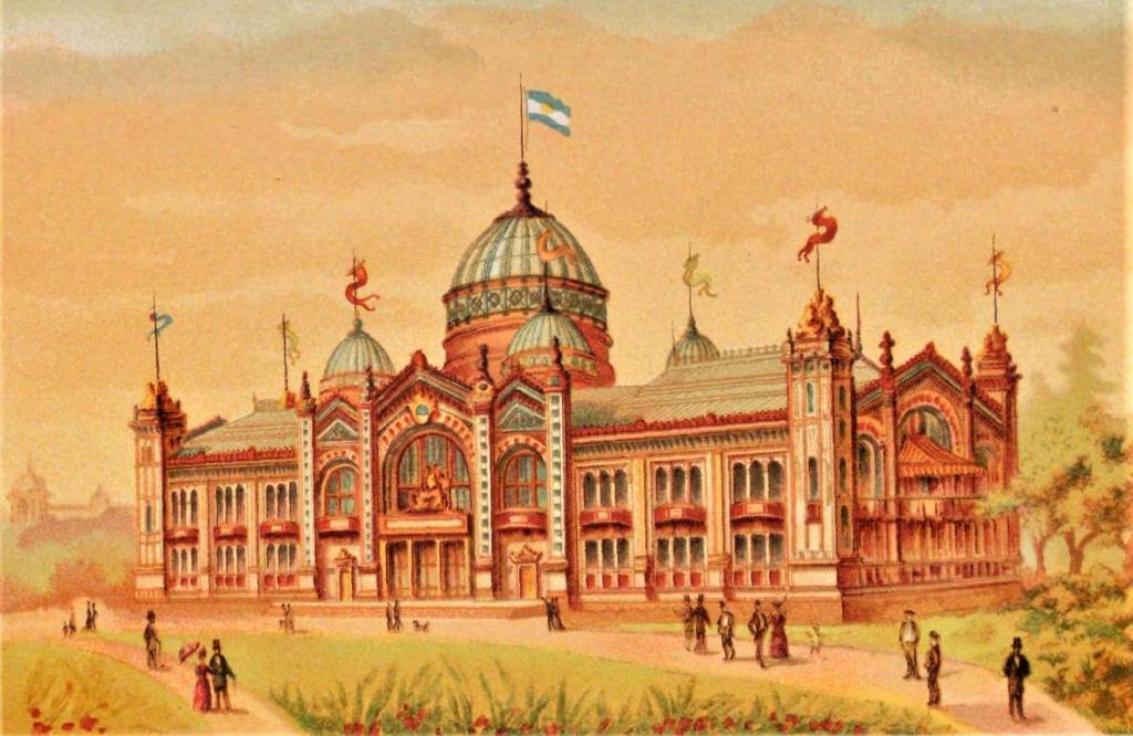 La República Argentina ocupa un edificio inmenso, el primero que ve el viajero transportado al Campo de Marte por el ferrocarril Decauville. Es un palacio de oropel: el vidrio, el hierro, la loza que entró en esta construcción tienen los colores más deslumbrantes. Por la noche, cuando la luz eléctrica hace resplandecer toda esta cristalería, el efecto es verdaderamente maravilloso; de cerca, el trabajo parece un poco tosco.