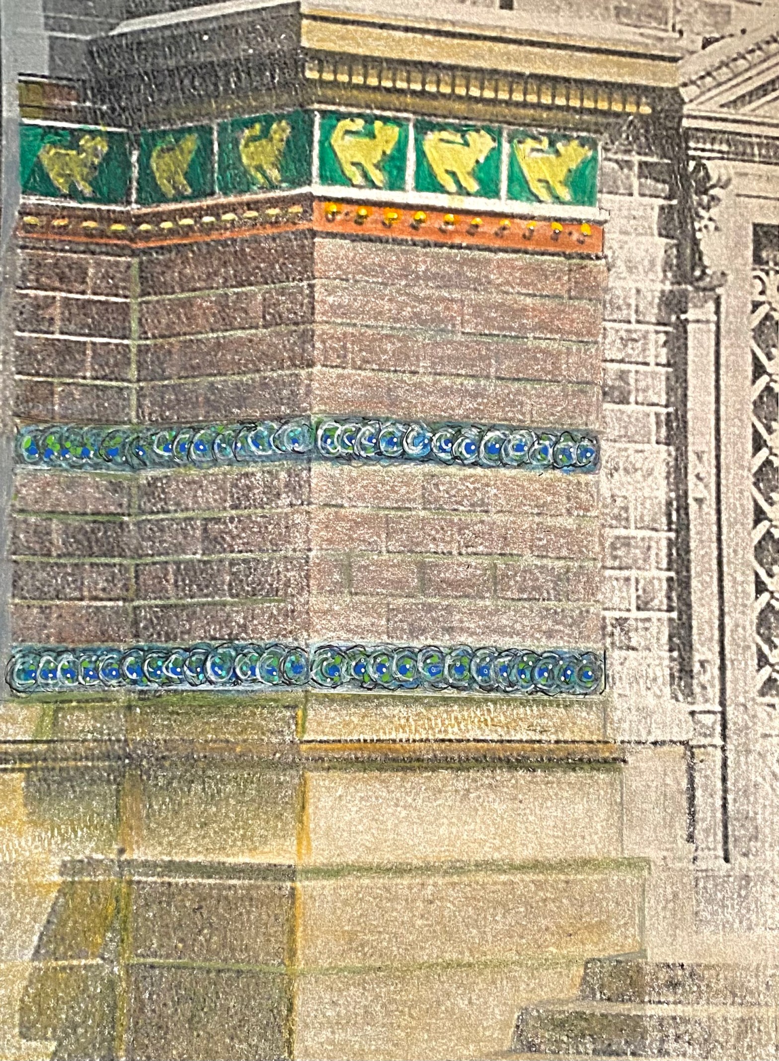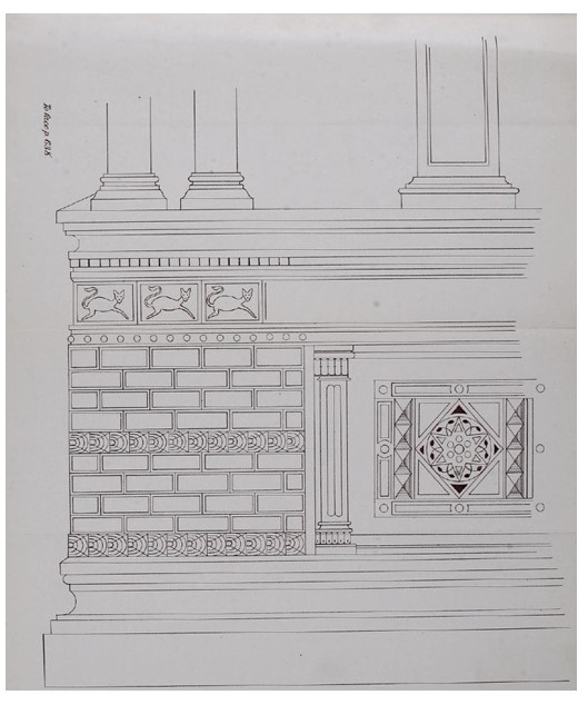 Para el rubro Tile and Mosaic Working (azulejos/baldosas y mosaicos) el elegido fue J. Brooke, de quien no se dan más datos. Comenta lo difícil que fue la tarea, debido al escrutinio constante de la policía, vigilando que no se hicieran bocetos, por lo que solamente podía hacer notas en trozos de papel. Esto explicaría por qué sus descripciones no se ajustan exactamente a la realidad en lo que hace a las medidas, y las diferencias aparentes en los dibujos y el texto que debe haber escrito al volver de la exposición. Las dos columnas en este dibujo son incorrectas, como también algunos detalles de la placa cerámica de la derecha y el ancho de la mencionada banda de siete pulgadas debajo de los felinos, que tanto en el dibujo como en la realidad era claramente algo más angosta que la de círculos concéntricos.