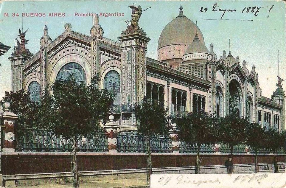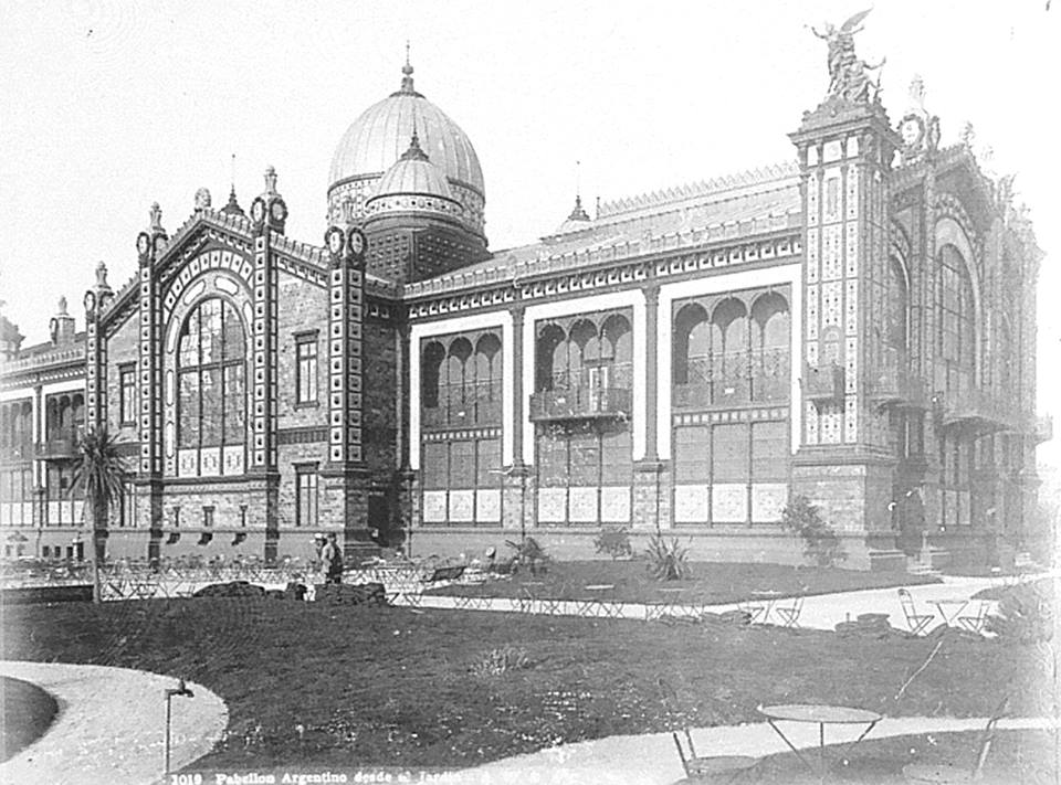 A su cabeza figura el pabellón argentino, edificado por M. Ballu, y que, desarmado y trasportado a Buenos Aires, figurará allí en breve con el título de Palacio de las Exposiciones. Su ornamentación fastuosa y multicolor, en la que el hierro fundido y forjado está realzado con el brillo de los azulejos polícromos, con el esplendor de los mosaicos y con los tornasolados reflejos de los cabujones de vidrios de colores, le da el carácter de una monstruosa joyería. Por la noche la electricidad enciende en sus cuatro fachadas novecientos puntos luminosos, y a semejanza de las piedras preciosas que destellan al ser heridas por las luces de una araña, los vidrios iluminados despiden reflejos encarnados, verdes y azules de los múltiples adornos de sus calados balconajes.