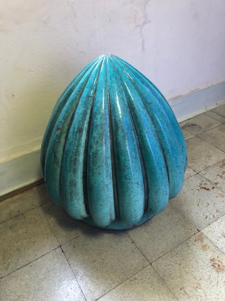 Una es el coronamiento de una las espigas (Inv. Nº MHS006183) que en número de doce decoraban la cresta de las fachadas. Debidas a la empresa Lœbnitz, una de las tres adjudicatarias en el rubro cerámicos, el museo conserva dos ejemplares, de un patriótico color celeste.