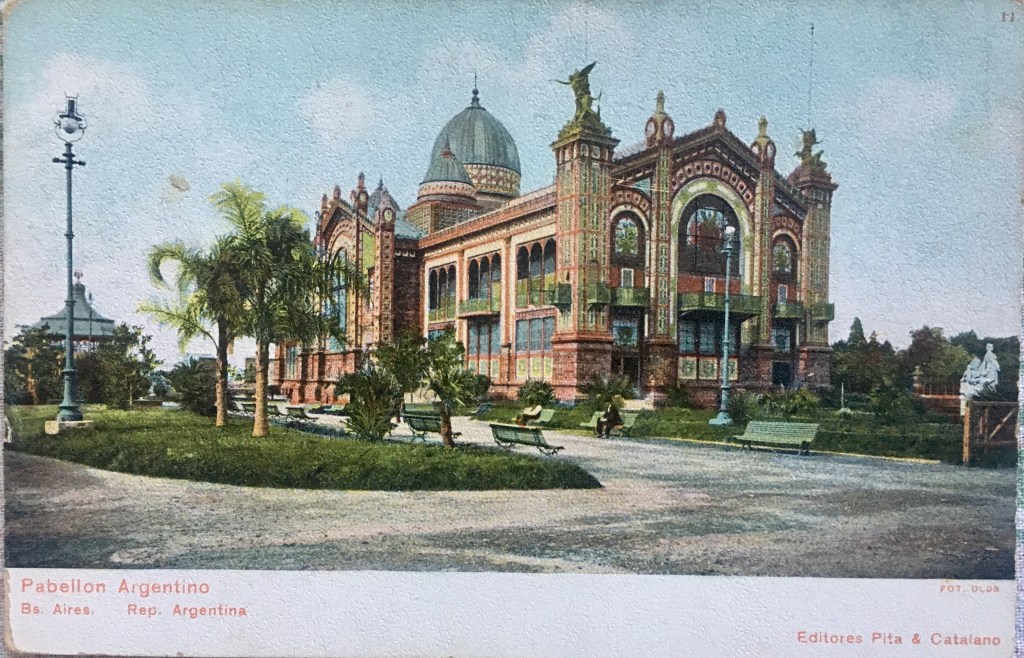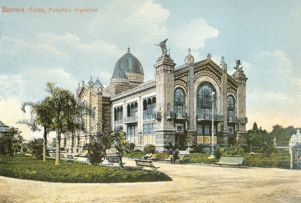 El pabellón argentino está formado por una enorme estructura metálica rellena y decorada con porcelanas de varios colores un poco vistosas pero no chillonas, ladrillos esmaltados en verde y amarillo anaranjado y hermosos mosaicos.