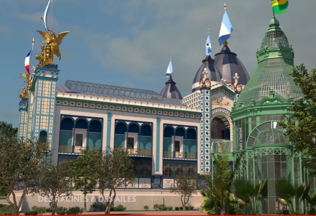 Párrafo aparte merece la reconstrucción digital animada y tridimensional de la torre Eiffel y edificios de la exposición realizada por Des racines et des ailes (Raíces y alas), un programa televisivo del canal France 3 que trata la arquitectura e historia de ese país. El Pabellón aparece a partir del minuto 5:27, pero los colores elegidos por los animadores y detalles como los vidrios de las cúpulas, los dos mosaicos de la fachada, etc., no se ajustan a la realidad. Sorprende la estructura de hierro pintada de celeste en vez de dorado, error tal vez debido a que la del interior, en el primer piso, llevaba ese color.