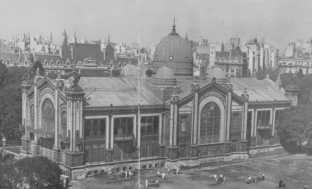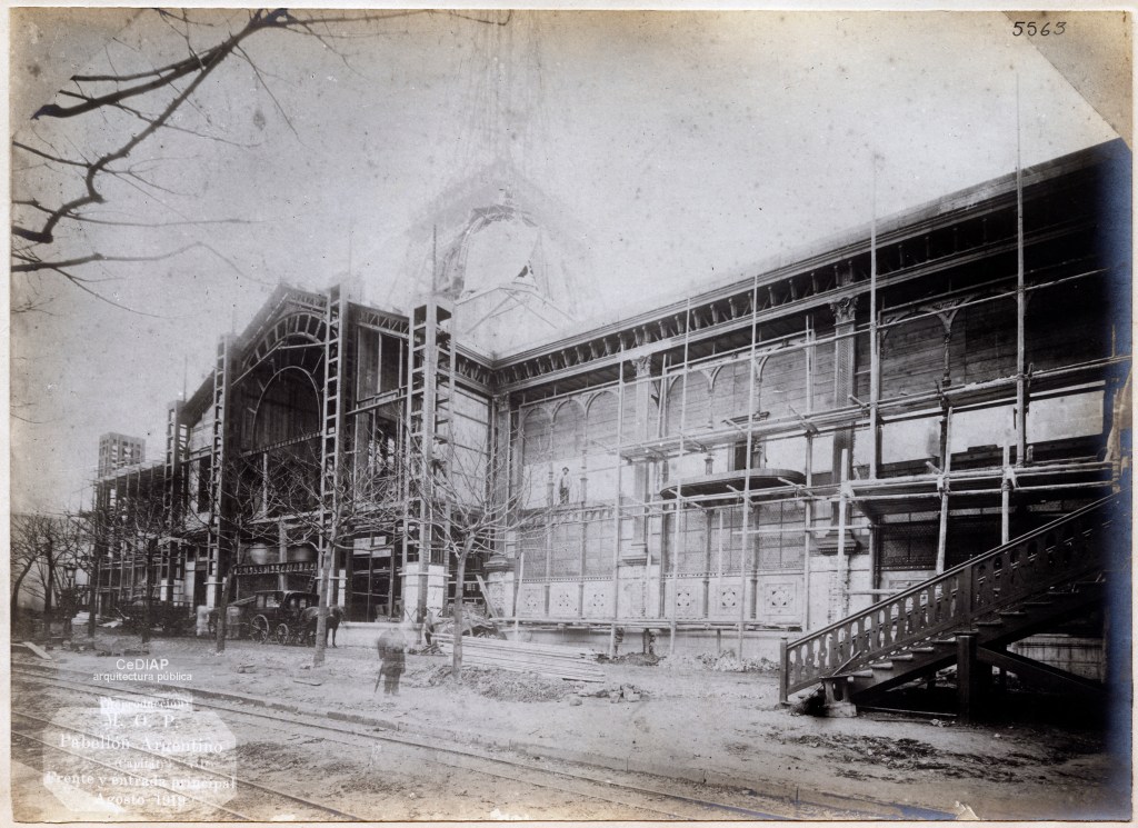 Comenzamos mirando cómo estaba construido el Pabellón, diseñado por el arquitecto francés Albert Ballu. Cuatro fotos del CeDIAP muestran la estructura en el desolado invierno de París. Pese a que la primera está rotulada «Detalle de la construcción», la fecha impresa (octubre 1919 en esta, agosto de ese año en las otras) es obviamente incorrecta – salvo que se refiera a la del ingreso de las imágenes a los archivos del M.O.P. Plantea una interesante pregunta: ¿Son entonces realmente de su construcción, a fines de 1888, o de su desarmado, en marzo de 1890? Me inclino por la primera, por el aspecto del entorno y porque habría sido cuando existía real interés en mostrar el progreso de la obra.