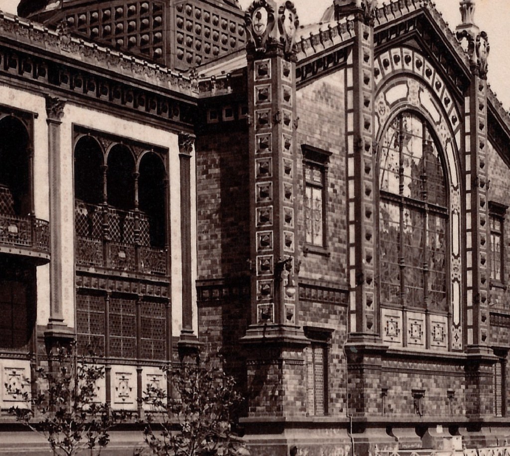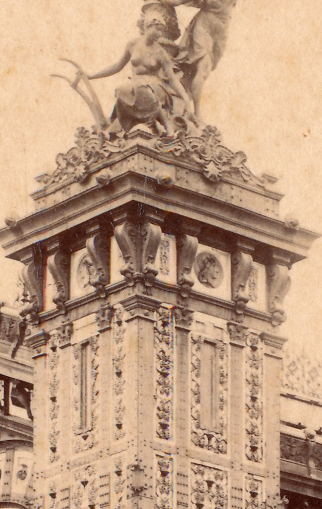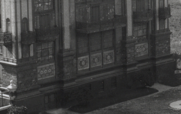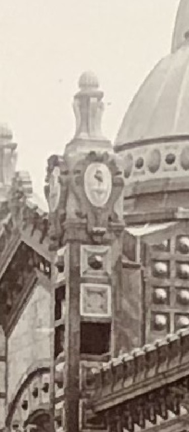 Es triste ver el deterioro gradual, como en este detalle de una foto de 1906, gentileza de Daniel Sale (gracias!). Faltan no sólo placas enteras en ese pilón, sino también un cabujón en una de ellas. Tampoco quedaban teselas del mosaico diseñado por Roll para ese lado de la fachada.