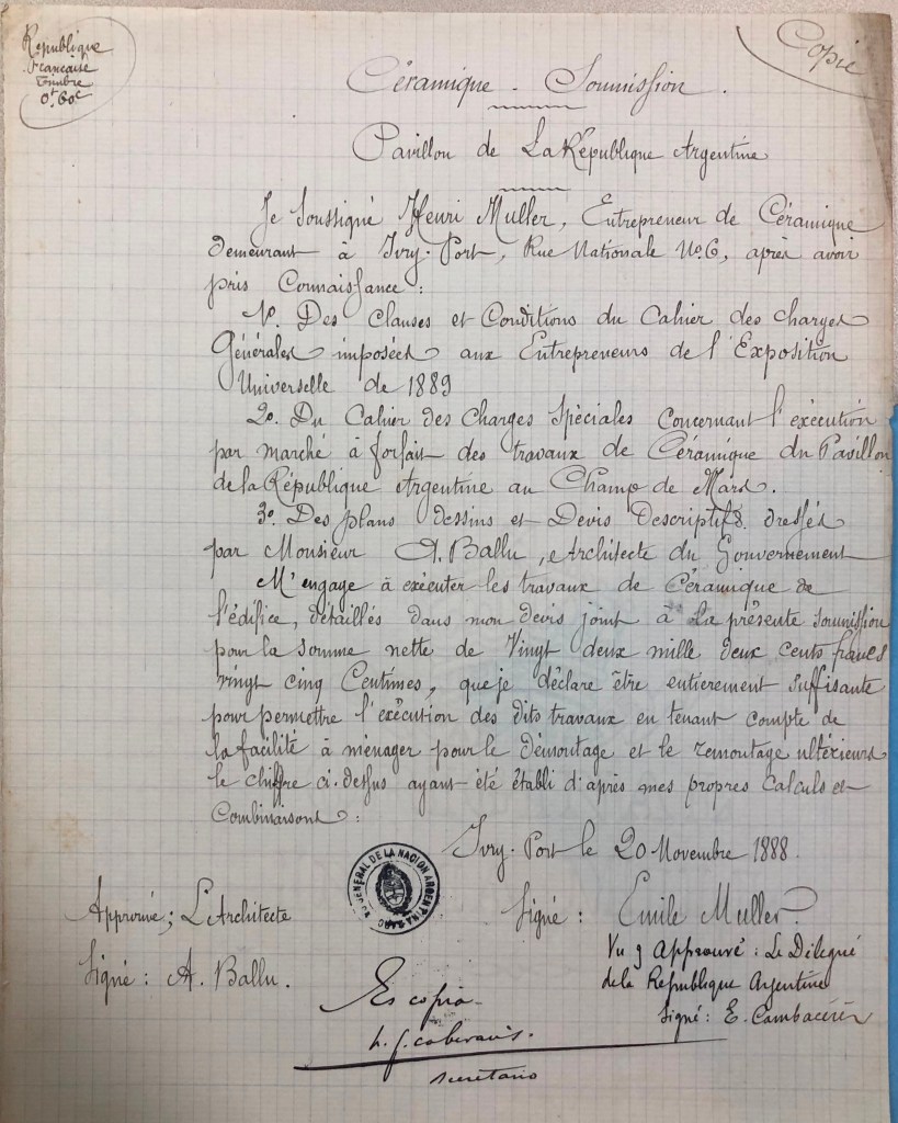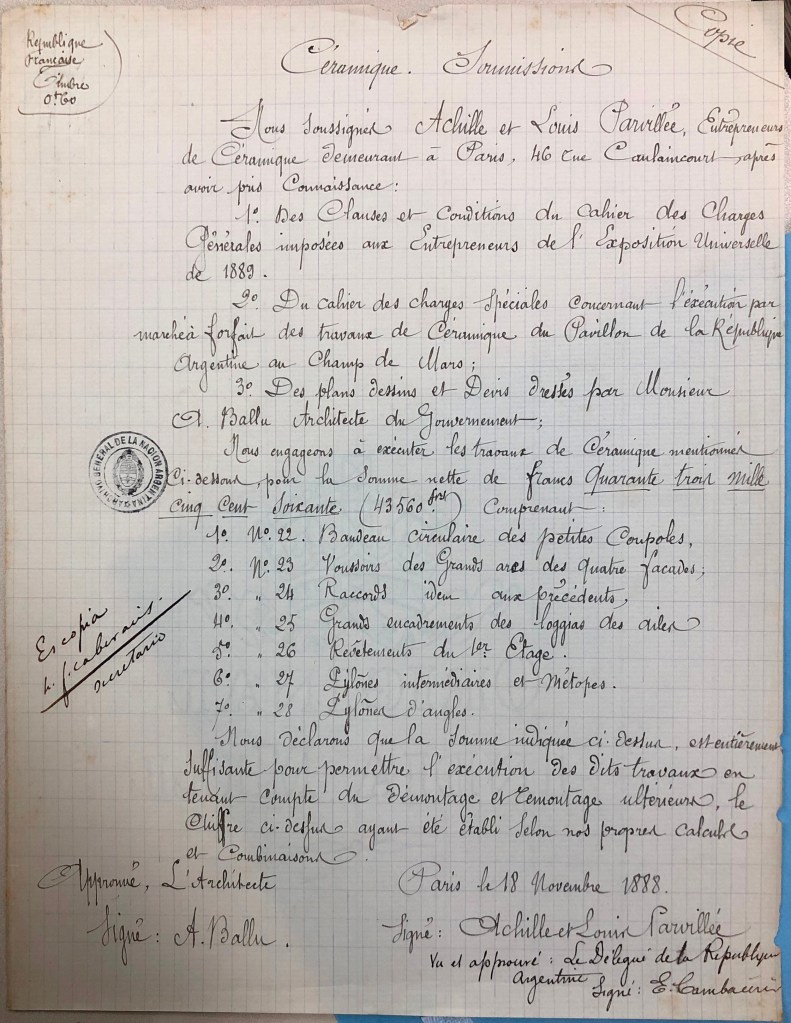 En su fondo Exposición de París, el AGN conserva copias de los pliegos de especificaciones (cahiers des charges), preparados por el estudio de Ballu, para casi todos los rubros de la obra. Falta el de los cerámicos, pero están las copias de los presupuestos de las empresas elegidas en las tres categorías, aprobados por Ballu y por Eugenio Cambacérès, delegado en París de la comisión directiva: Lœbnitz para las terracotas, Parvillée para las lozas y porcelanas, y Muller para los gres.