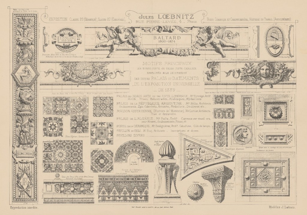 Una lámina de su catálogo, gentileza de Laurent Noet, a quien agradezco, está titulada Motivos principales en terracota o terracota esmaltada empleados en la decoración de diversos palacios y edificios de la Exposición Universal de 1889. Aparecen varios del Pabellón Argentino, junto con los de otros edificios de la muestra, como los palacios de Bellas Artes y Artes Liberales, el de Argel, también diseñado por Ballu, la Casa Asiria de la Historia de la Habitación, etc.