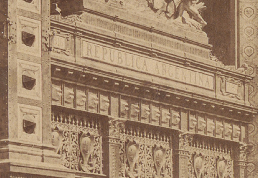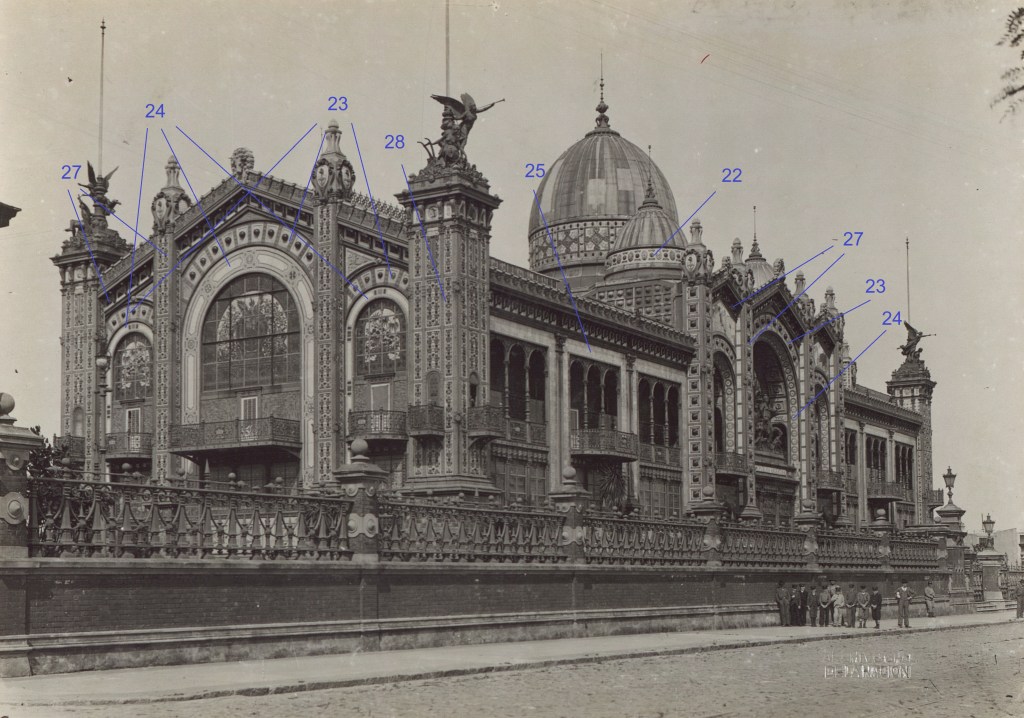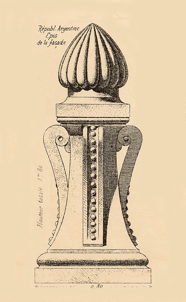 Los pilones de las esquinas también son interesantes y constituyen una de las primeras aplicaciones de porcelana esmaltada realizada especialmente para la construcción, por los Srs. Parvillée, quienes también la probaron en una cúpula del Palacio de las Artes Liberales, con el verde y el amarillo de la cúpula del palacio argelino y los paneles entre las columnas de la galería en el primer piso de la Torre Eiffel. Los pilones de los que hablamos, decorados con incrustaciones de vidrio y loza de colores vivos, nos parecen chillones, con un aspecto de baratijas de bastante mal gusto y carácter poco arquitectónico, pero se trata de un motivo argentino del que no diremos más, simplemente queriendo llamar la atención sobre el nuevo material utilizado.