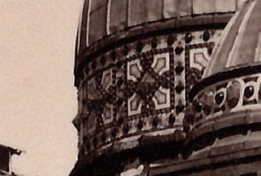 La faja de la cúpula principal fue reemplazada por otra de diseño más sencillo, como vimos en Cúpulas. Las placas de Parvillée en los pilones esquineros e intermediarios, por ladrillos.