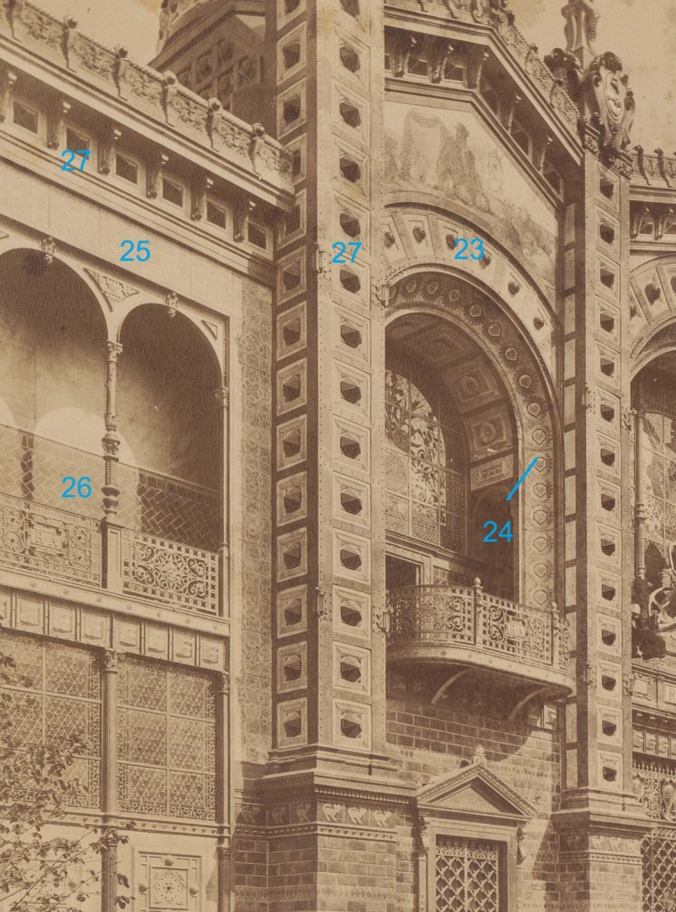 En las siguientes fotografías, varios productos de Parvillée en la fachada principal. Se ve claramente el diseño de los azulejos del Nº 25, el gran marco de las loggias, y si bien la descripción es ambigua, los revestimientos del 1er piso (Nº 26) deben ser las baldosas que tapizaban las paredes de las mismas. Los pilones intermediarios de esta fachada y de la trasera (Nº 27) llevaban placas con cabujones de vidrio verde, como las metopas señaladas en el friso de la fachada lateral, donde eran angulares, y en esta, rectas.