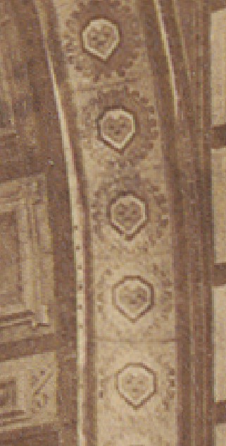 La siguiente foto muestra dovelas, metopas y empalmes. Las dos primeras llevaban sobre la loza cabujones de vidrio de color, verde y rosa al oro, respectivamente, también provistos por Néret. Cubrían lamparitas eléctricas, que se encendían al anochecer.