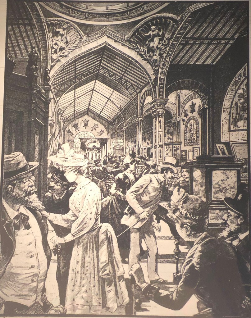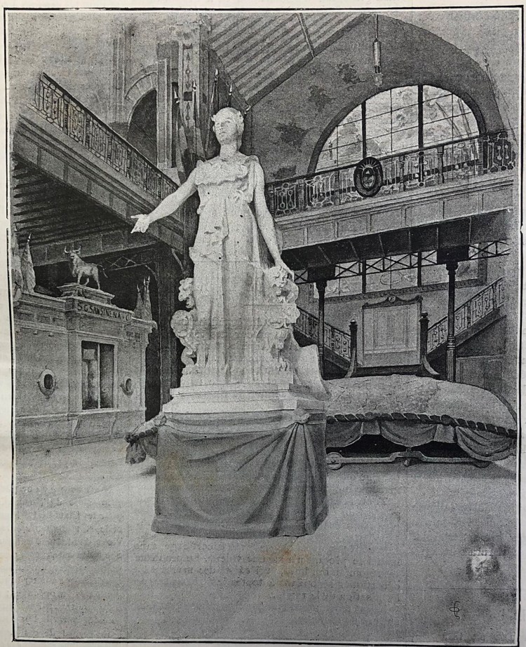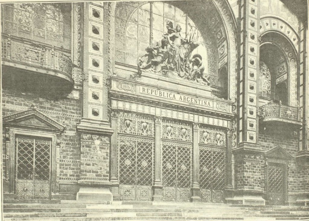 Lo primero que veía el visitante al entrar al Pabellón era el gran yeso de Roulleau representando a la República Argentina, dándole la bienvenida. Ya lo comentamos en una nota anterior. Aparece en un grabado de la Revue Illustrée du Rio de la Plata, el 1º de septiembre de 1889. A la izquierda de la estatua, la cámara frigorífica de la empresa Sansinena; detrás el gran mapa en relieve de la República, realizado por el Dr. Brackebusch, y luego la escalera que llevaba al primer piso, con el vitral de Toché al fondo, formando el centro de la fachada trasera.