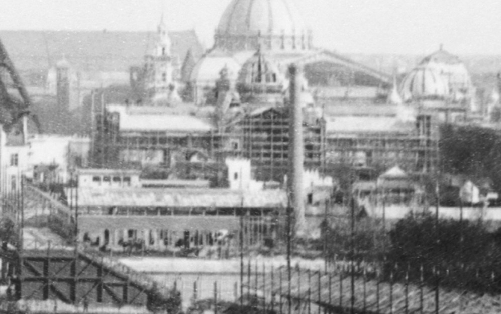 En las dos primeras, toda la fachada trasera está cubierta de andamios, y no se ha terminado la cúpula principal. La torre del pabellón de Brasil, con andamios, y el de Bolivia, más visible en la segunda, también en obra.