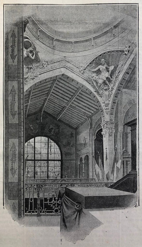 Finalmente, de ese mismo número de la Revue Illustrée du Rio de la Plata, una vista de la fachada trasera desde el otro extremo del primer piso. Además de las esculturas de las pechinas de la cúpula, ya mencionadas en otra nota, se ve el vitral de Toché. A su derecha, en alto, el óleo El sembrador, de Duez, perdido con otras telas en el cruce del Atlántico, y motivos autóctonos decorando la columna de la izquierda.