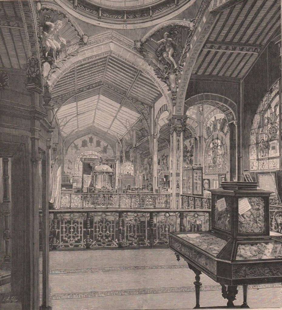 En los años que llevo estudiando el Pabellón, vi solamente una fotografía del interior, que compré en eBay y comenté en El interior en París. Vemos uno de los laterales del primer piso, con elaboradas vitrinas y decorado con cueros y pieles de animales.